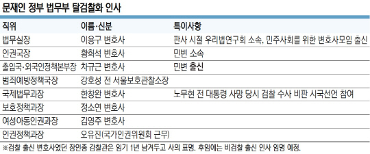 법조계에서는 탈검찰화를 명목으로 임명된 법무부 실·국·본부장 인사들이 대체로 친정부 성향의 인사란 점에 우려를 표하고 있다. 이용구(54·사법연수원 23기) 법무실장은 판사 시절 우리법연구회 소속이자, 변호사 개업 후 민변에 몸담은 적이 있다. 황희석(51.31기) 인권국장은 현재까지 민변에 소속돼 있다. 차규근(50.24기) 출입국외국인정책본부장도 민변 출신이다. 우리법연구회와 민변은 참여연대와 더불어 문재인 정부의 ‘인재풀’이라는 지적을 받고 있다. 법무부가 탈검찰화라는 명목하에 사실상 친정부 성향의 인사를 요직에 배치했다는 지적이 나오는 이유다.