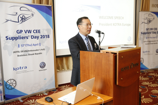 코트라는 12일(현지시간) 슬로바키아 수도 브라티슬라바에서 폭스바겐 중유럽구매사무소(VW CEE)와 함께 현지 진출한 국내 부품업체들의 납품 기회 확대를 위한 ‘2018 폭스바겐 글로벌 파트너링 상담회’를 개최했다고 13일 밝혔다. 세계 최대 완성차업체로 2016년 기준 1665억 유로(220조 원) 규모의 부품을 구매한 폭스바겐은 전체 부품 구매량의 65%인 1082억 유로(143조 원)어치를 유럽 현지 구매했다. 이 가운데 VW CEE는 중유럽 17개 폭스바겐 공장에 투입되는 부품 납품을 위해 20여 개국 협력업체 관리를 책임지고 있다.