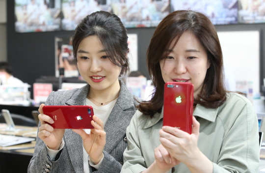 아이폰 레드(RED) 시리즈의 국내 판매가 시작된 가운데 고객들이 17일 서울 종로구 광화문 KT 올레스퀘어에서 아이폰8 레드 스페셜 에디션을 살펴보고 있다.