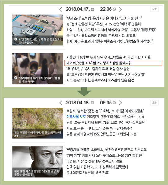 네이버는 또 이 기사를 클릭 수가 적은 시간대에 노출하는 방법을 썼다. 네이버는 이 기사를 지난 17일 밤 10시 6분부터 18일 새벽 6시 35분까지 메인에 뒀다. 사람들의 기사 클릭이 많은 출퇴근 시간, 점심·저녁 시간을 피해 기사를 노출했다는 의심을 살 수 있는 대목이다.