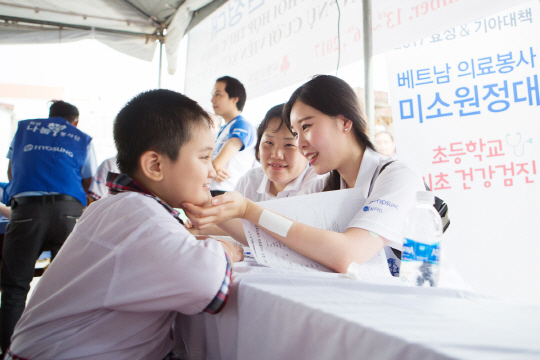 효성의 사회공헌 활동은 해외에서도 활발하다. 국제구호단체 기아대책과 함께 지난해 11월 베트남 호찌민시 인근 동나이성 롱토 지역에 의료봉사단 ‘미소원정대’(사진)를 파견해 주민 약 1800명을 대상으로 무료 진료를 해줬다. 올해 3월에는 지난해 12월 베트남에서 열렸던 ‘KLPGA 효성챔피언십’ 대회의 경품 판매 수익금과 기부금을 모아 빈탄 초등학교에 미니 도서관을 기증했다.