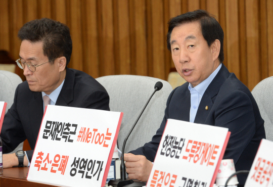 김성태(오른쪽) 자유한국당 원내대표가 26일 오전 국회에서 열린 확대원내대책회의에서 모두발언을 하고 있다.