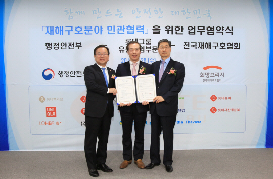 롯데그룹은 25일 정부세종청사에서 행정안전부·전국재해구호협회와 함께 재해구호 업무협약(MOU)을 체결했다.