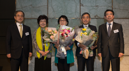 서울대 출신 언론인들의 모임인 관악언론인회(회장 이용식 문화일보 논설주간)가 25일 서울 중구 더플라자호텔에서 열린 정기총회에서 홍준호 조선일보 발행인 겸 대표이사에게 제15회 ‘서울대 언론인 대상’을 수여한 뒤 기념사진을 찍고 있다. 왼쪽부터 박찬욱 서울대 교육부총장, 신수정 서울대 총동창회장, 홍 발행인 부인 윤혜원 씨, 홍 발행인, 이 회장.