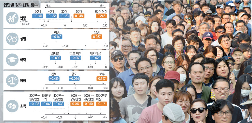 이념·지역 다음으로는 연령별 정책입장 점수 차이가 컸다. 전체적으로 60대 이상(0.242점) 유권자들이 가장 보수적이었고, 20대 유권자들이 가장 진보적(-0.151점)이어서 두 집단 간의 차이가 0.393점에 달했다. 영호남의 지역갈등이 여전하지만 영향력 면에서는 이념갈등에 자리를 내주고 있음을 알 수 있다. 이번 조사를 지휘한 한규섭 서울대 언론정보학과 교수는 “최근 지역색이 옅어지면서 지역보다는 진보와 보수 등 이념에 따라 정책입장을 정하는 성향이 뚜렷하다”며 “한국 사회가 서구적인 이념지형으로 변해가고 있다고 해석할 수 있다”고 말했다.