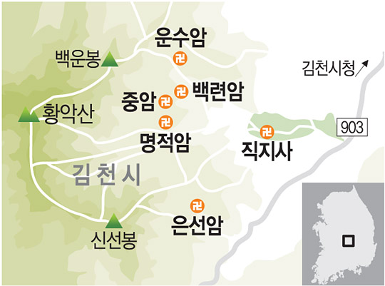 어디서 묵고 무엇을 맛볼까 = 직지사 입구 주차장 인근의 파크호텔(054-437-8000)을 추천한다. 직지사 입구에 민박집들도 많다. 김천 혁신도시에 로제니아 호텔(054-429-4700)이 있다. 청암사나 수도암 부근에도 인근 수도산 등산객을 위한 모텔, 민박집들이 많다.