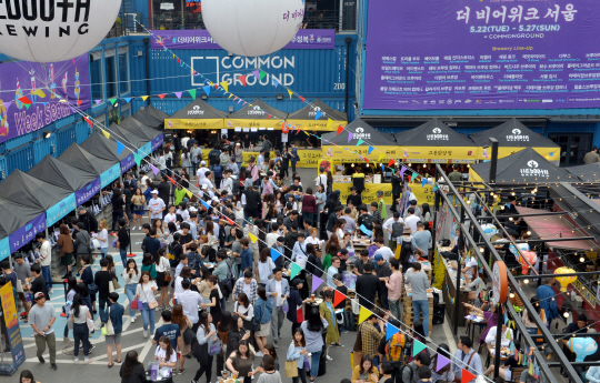 22일 서울 광진구 커먼그라운드에서 열린 ‘더 비어 위크 서울’ 행사장을 가득 채운 관람객들이 수제 맥주 등 다양한 맥주를 즐기고 있다.