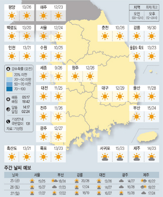 전국이 대체로 맑겠다. 아침 최저기온은 7도에서 16도, 낮 최고기온은 21도에서 30도가 되겠다.