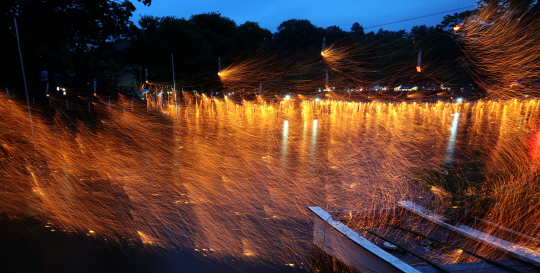 22일 경남 함안군 무진정 일대에서 열린 경남 무형문화재 제33호 ‘함안 낙화놀이’에서 화려한 불꽃놀이 행사가 펼쳐지고 있다.