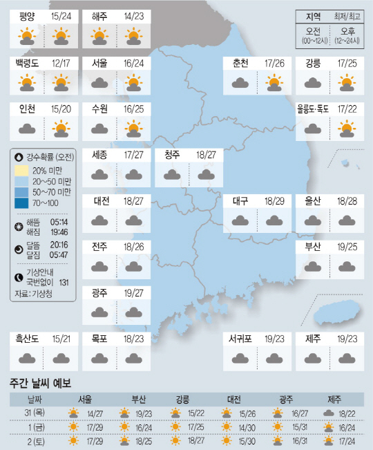 전국에 가끔 구름이 많겠다. 아침 최저기온은 15도에서 20도, 낮 최고기온은 20도에서 29도가 되겠다.