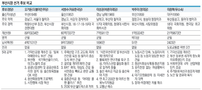 전문가들은 6·13 지방선거 부산시장 선거 향방을 가를 주요 변수로 세대별 투표율과 샤이(shy)보수 존재, 부동층 선택, 대통령 지지율 등을 꼽았다. 현재 여론조사에서 오거돈 더불어민주당 후보가 서병수 자유한국당 후보를 앞서고 있지만 이 같은 변수가 작용할 경우 선거 판세가 요동칠 수 있다는 관측이 조심스럽게 제기됐다. 다만 야권 후보들 간 단일화나 네거티브 공세는 현 시점에서 크게 의미가 없을 것이라는 전망이 지배적이다.