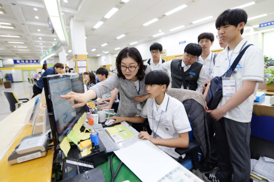 30일 서울 동대문구청에서 진행한 공무원 직업체험 행사에 참가한 한 학생이 직원의 도움을 받아 민원서류를 발급하고 있다.
