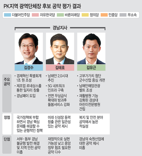 경남지사 선거 후보들은 공통적으로 조선업·제조업 등의 쇠퇴로 침체된 지역 상황을 감안해 경제와 복지 부문 정책을 주요 공약으로 내세웠다. 하지만 이들 모두 공약 이행 기간과 재원조달 방법 등은 구체적으로 제시하지 못하고 있다는 지적이 나왔다. 7일 한국정책학회·문화일보의 공약 평가에서 김경수 더불어민주당 후보는 다른 후보들과 비교할 때 중앙정부의 예산 확보 등 집권여당 후보로서 프리미엄을 활용할 수 있는 공약을 다수 제시했다. 5대 공약 중 3개가 경제 분야일 정도로 경제 살리기에 집중했다. 자신이 침체된 지역 경제를 살릴 수 있는 ‘힘 있는 여당 후보’임을 부각하는 데 주력한 것이다. 구체적으로는 제조업과 혁신산업의 결합을 통해 기존 제조업의 경쟁력을 강화하고 혁신 성장산업을 집중 육성하겠다는 목표를 내걸었다. 이를 위해 경제혁신특별회계 1조 원 조성, 경남 연구·개발(R&D)체계 구축을 통한 제조업 르네상스 등의 공약을 제시했다. 특히 자영업자·소상공인 전용 지급 결제 시스템을 개발해 카드 수수료 부담을 경감하기 위한 ‘경남페이’, 농산물 최저가격보장제 도입 등은 혁신성 면에서 돋보인다는 평가를 받았다. 개방과 소통, 주민참여 등에 많은 공을 들인 것도 긍정적으로 평가받았다. 하지만 국가균형발전특별회계 확보, 어르신 일자리 수당 40만 원 인상 등 일부 공약은 중앙정부 도움 없이는 실현 가능성이 높지 않다는 지적이 나왔다. 또 서부경남과 동부경남의 불균형 발전 문제 해결을 위한 공약 등 새로운 비전을 제시하거나 가치를 창출할 수 있는 공약은 미흡하다는 평가도 나왔다.
