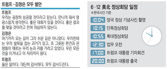 이어 트럼프 대통령은 “위대한 논의를 할 것이고, 굉장히 큰 성공적인 결과를 거둘 것”이라면서 성공적인 회담을 자신했고 김 위원장도 “우리한테는 발목을 잡는 과오가 있고 그릇된 관행들이 때로는 우리 눈과 귀를 가렸는데, 모든 것을 이겨내고 이 자리까지 왔다”고 밝혀 회담에 대한 기대감을 나타냈다. 트럼프 대통령이 한때 정상회담 취소를 선언했던 것을 언급한 것으로, 트럼프 대통령도 김 위원장의 지적에 맞장구를 칠 정도였다. 그만큼 양국 정상의 합의에 대한 열망이 강한 셈이다.