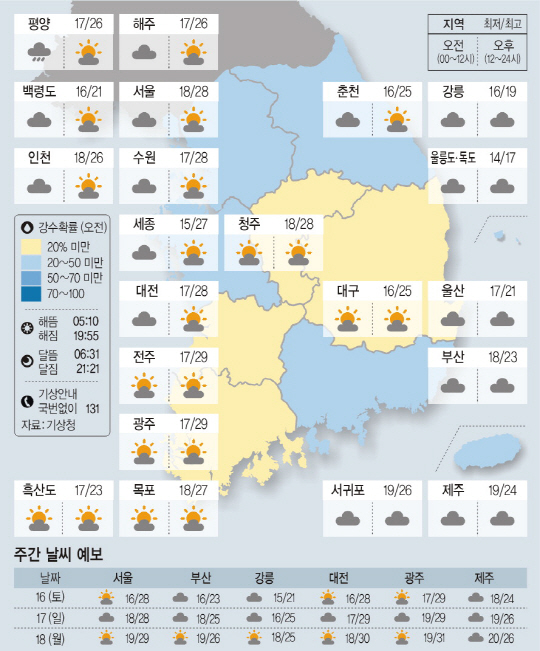 전국이 대체로 맑겠다. 아침 최저기온은 14도에서 18도, 낮 최고기온은 18도에서 29도가 되겠다.