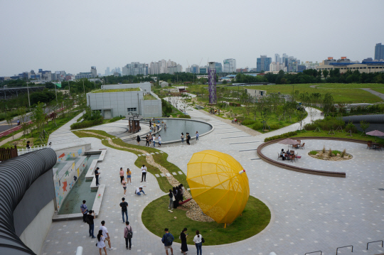 지난해 9월 하수처리장 서쪽 1만8840㎡ 부지에 만들어진 테마파크는 물을 직접 만지고 체험하며 조용히 산책할 수 있는 곳이다. 도심 속에 있지만 인위적인 요소를 최대한 배제하고 정수된 하수로 자연성을 살린 것이 특징이다. 공원 초입 우산을 형상화한 조형물을 지나면 ‘다목적 물놀이터’가 나온다. 물레방아와 도르래가 설치된 물 체험장이어서 주말 가족 단위 방문객의 이용이 많았다. 놀이터 맞은편 실개천에서 졸졸 흐르는 물소리를 들으며 5분여를 걷자 억새와 수크령 등 5가지 수풀들로 우거진 ‘회복의 습지’가 나왔다. 습지를 따라 있는 수중 생물 서식용 돌무더기와 벌채목을 보고 있으면 조용한 정원에 온 것 같은 느낌이 든다. 공원 내 보도는 빗물 흡수력이 좋은 ‘투수성 포장재’로 조성했다. 흡수된 빗물을 지하 정수시설로 보내 정화 후 실개천과 정원 운영에 쓰면서 수자원 재활용의 대안을 제시했다는 게 서울시의 설명이다.