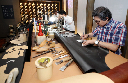 19일 서울 종로구 국립민속박물관에서 ‘근현대 직업인 생애사’ 사업의 일환으로 열린 ‘세대를 넘어-수제화 장인’ 특별전에서 송림수제화의 장인들이 수제화를 만들고 있다.