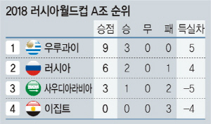 포르투갈의 크리스티아누 호날두(레알 마드리드), 우루과이의 루이스 수아레스(FC 바르셀로나) 골잡이 대결이 일찍 연출된다. 우루과이는 러시아 사마라아레나에서 열린 3차전에서 개최국 러시아를 3-0으로 누르고 3연승을 달렸다. 13번째 월드컵 본선에 진출한 우루과이가 조별리그 3전승으로 16강에 진출한 것은 이번이 처음이다. 수아레스가 전반 10분 프리킥 상황에서 찬 오른발 땅볼 슈팅이 그대로 낮게 깔려 러시아의 골망을 흔들었다. 그리고 전반 23분 러시아의 자책골, 후반 막판 에딘손 카바니(파리 생제르맹)의 쐐기골이 이어졌다. 수아레스는 월드컵 통산 득점을 7골로 늘려 우루과이 역대 최다득점(8골·오스카르 미게스)에 1골 차로 다가섰다. 또 자신이 골을 넣은 월드컵 경기에서 무조건 승리한다는 2010 남아프리카공화국월드컵부터 이어진 기분 좋은 징크스를 5경기째 이어갔다.