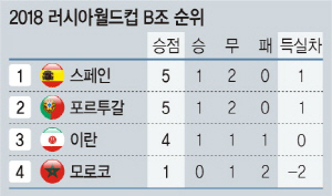스페인과 포르투갈은 1승 2무(승점 5), 골득실(+1)이 같았지만 다득점에서 스페인(6골)이 1골 앞서 조 1위가 됐다.