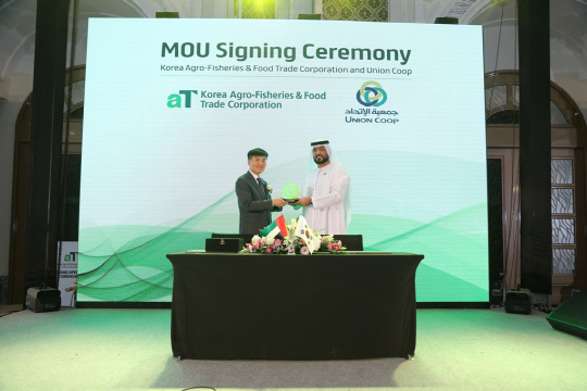 aT(한국농수산식품유통공사·사장 이병호)는 아랍에미리트(UAE) 두바이 세인트레지스 호텔에서 우리 농식품의 중동시장 진출 확대를 위해 현지 유력 대형유통매장인 유니언쿱(UNION COOP)과 업무협약을 체결했다고 27일 밝혔다.