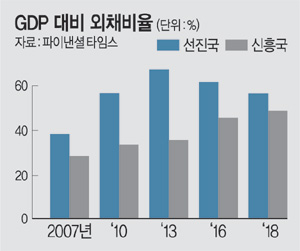 <그래픽>은 글로벌금융위기 후 선진국과 달리 신흥국에서 GDP 대비 외채비율이 계속 증가해 온 추세를 보여준다. 그러므로 달러화가 강세로 돌아설 때 신흥국의 위험이 높아지는 것은 당연하다.
