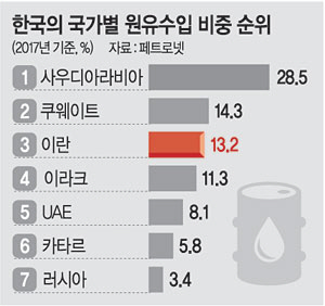 27일 한국석유공사에 따르면 2015년 1월 국내 전체 원유 수입량 8470만2575배럴 중 이란산은 199만4514배럴로 2.4%에 불과했다. 그러나 2016년 5월에는 전체 수입량 9269만7686배럴 중 이란산이 982만1622배럴로 10.6%를 차지, 10%선을 넘어섰다. 이어 지난해 3월에는 전체 원유 수입량 9591만3180배럴 중 이란산 원유가 1853만6487배럴로 19.3%까지 비중이 치솟았다. 가장 최근 집계된 지난 5월에는 전체 9518만2053배럴 가운데 이란산이 600만6588배럴로 비중이 6.3%로 낮아졌다. 하지만 여전히 5월 한국이 원유를 수입한 22개국 중 이란산이 7번째로 많았다.