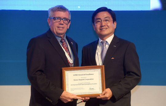 한국공항공사가 3일 서울 그랜드인터컨티넨탈에서 열린 2018 세계항공교통학회(ATRS) 총회에서 아·태지역 최우수 공항운영그룹으로 선정돼 김명운(오른쪽) 사장직무대행이 마이크 윌리엄스 엠브리리들 항공대(ATRS 이사) 교수로부터 수상하고 있다.