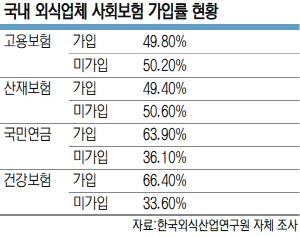 한국외식산업연구원은 최근 자체 조사 결과 외식업계의 고용보험 미가입률은 50.2%에 달한다고 5일 밝혔다. 지난해 기준 고용노동부 통계상 외식업을 포함한 도소매·숙박음식점의 가입률(58.9%) 보다 가입률이 낮다. 일자리 안정자금의 지원 조건은 근로자 월 보수 최대 210만 원 미만, 근로자 30인 미만, 고용보험 가입 등 3가지다. 고용보험에 가입하지 않아 일자리 안정자금을 받지 못하는 업체가 상당수에 이르는 실정이다. 산재보험 50.6%, 국민연금 36.1%, 건강보험 33.6% 등 나머지 4대 보험도 외식업계의 미가입률이 높았다. 특히 외식업계 비정규직의 경우 고용보험 가입률이 23.1%까지 떨어졌다.