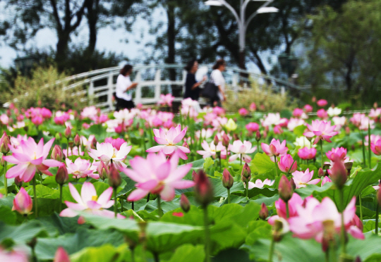 5일 연꽃문화제가 열리는 경기 양평군 양서면 세미원을 찾은 시민들이 활짝 핀 연꽃 옆을 지나가고 있다.