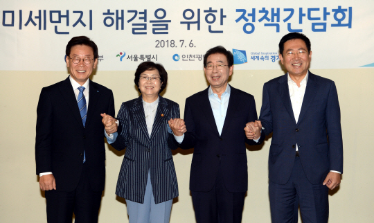 김은경 환경부 장관과 박원순 서울시장, 박남춘 인천시장, 이재명 경기지사는 6일 오전 서울 중구의 한 식당에서 만나 ‘미세먼지 해결을 위한 정책간담회’를 열고 미세먼지 해결을 최우선 정책과제로 설정하고 협력을 강화하기로 했다.