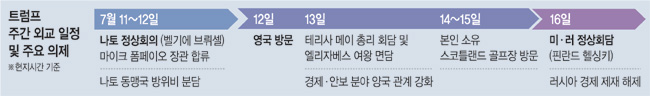 8일 뉴욕타임스(NYT) 등 미국 언론들은 트럼프 대통령의 1주일간의 외교 일정을 소개하며 “가는 곳마다 중요한 쟁점들이 기다리고 있다”고 전했다. 가장 먼저 그를 기다리고 있는 것은 11~12일 벨기에 브뤼셀에서 열리는 나토 회원국들과의 정상회의다. 지난 6월 주요 7개국(G7) 정상회의에서 무역 관세 문제로 앙겔라 메르켈 독일 총리 등과 맞붙은 적이 있는 트럼프 대통령은 이번 정상회의에서 다시 갈등국면을 빚을 것으로 보인다. 트럼프 대통령은 ‘무임 승차론’을 내세우며 독일을 비롯한 나라에 국내총생산(GDP) 대비 2%까지 방위비를 인상할 것을 요구할 방침이다. 하지만 그나마 경제 여건이 좋은 독일의 방위비 분담금이 GDP 대비 1.2%(2017년 기준)인 것을 감안하면 다른 나라들이 이를 순순히 받아들일 가능성은 적다. 나토 회원국들은 미국산 무기 수입 실적을 언급하면서 부담금 증액에 반대할 것으로 관측되고 있다.