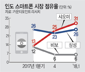 현재 삼성전자는 중국업체들의 거센 도전을 받고 있다. 인도 시장 부동의 1위였던 삼성전자는 지난해 4분기 처음으로 샤오미에 ‘왕좌’를 내줬다. 시장조사업체 카운터포인트 리서치에 따르면, 2017년 1분기 기준 시장점유율 13%에 불과하던 샤오미는 같은 해 4분기 점유율을 25%로 크게 확대하며 삼성전자(23%)를 따돌렸다. 이 기세를 몰아 샤오미는 올해 1분기에도 31%의 점유율을 기록, 삼성전자(26%)와의 점유율 차를 5%포인트로 늘렸다. 현재 샤오미, 비보, 오포 등 중국 업체의 시장 점유율 합계는 50%에 이른다.