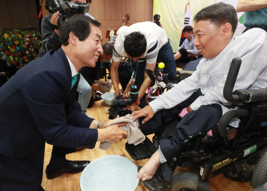 문석진(왼쪽) 서울 서대문구청장이 9일 서대문구청에서 열린 취임식에서 구민 대표의 발을 씻겨주는 세족식을 하고 있다.