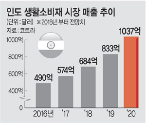 10일 코트라에 따르면 인도의 생활소비재 시장은 연평균 무려 27.7% 성장하고 있다. 지난해 574억 달러에서 올해 684억 달러로 성장하고, 오는 2020년에는 무려 1037억 달러에 이를 것으로 전망된다.
