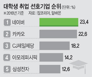잡코리아와 알바몬이 전국 4년제 대학에 재학 중인 재·휴학 남녀 대학생 1531명을 대상으로 시가총액 상위 100대 기업 고용브랜드를 조사한 결과, 네이버에 취업하고 싶다고 답한 학생이 23.4%(복수 응답)로 가장 많았다. 네이버 다음으로는 카카오가 22.6%로 뒤를 이었고, CJ제일제당과 아모레퍼시픽, 삼성전자 등이 서열 5위 안에 들었다.