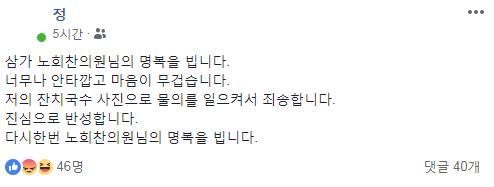 정씨는 “삼가 노회찬 의원님의 명복을 빈다”며 “저의 잔치국수 사진으로 물의를 일으켜 죄송하다. 진심으로 반성한다”고 밝혔다.