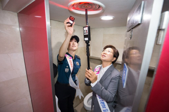 김미경(사진 오른쪽) 서울 은평구청장이 몰카 추방을 위해 직접 공중화장실 불법촬영 장비 점검에 나섰다.