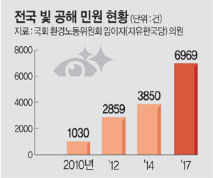 27일 국회 환경노동위원회 임이자(자유한국당) 의원이 환경부로부터 제출받은 자료에 따르면, 빛 공해 민원은 2010년 1030건, 2012년 2859건, 2014년 3850건, 2017년 6969건으로 7년 사이 약 7배로 증가했다. 빛 공해와 관련해 지난 2007년 세계보건기구(WHO)는 빛 공해를 발암물질로 지정했다. 지난해 이은일 고려대 의대 교수 등 국내 연구진은 수면 중 약한 빛 노출만으로도 뇌 기능이 저하되고 유방암과 전립선암 등 질병을 초래할 수 있다고 경고했다.