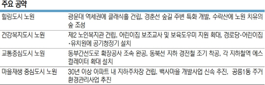오 구청장은 “노원구는 지리적으로 서울 변두리인 데다 산업단지나 대형 시설이 없는 베드타운인 것이 현실”이라며 “장거리 출퇴근에 지친 주민들이 제대로 쉴 수 있는 공간부터 만드는 게 옳다고 생각했다”며 ‘힐링 도시’의 필요성을 강조했다. 그는 서울시가 건립을 추진 중인 2000석 규모의 대형 클래식홀을 지하철 1호선 광운대 역세권으로 유치하는 한편, 수락산·불암산 등 4개의 산이 있는 지역 특성을 활용해 즐겁게 쉴 수 있는 공간을 만들겠다는 계획을 내놨다.