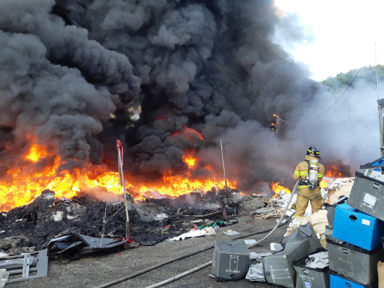 30일 오후 경기 포천시 내촌면의 한 플라스틱 재활용 시설 야적장에 불이 나 소방관이 진화작업을 하고 있다.