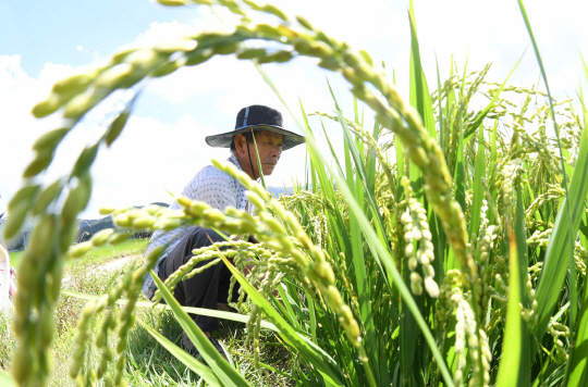 절기상 가을에 접어들었음을 알리는 입추를 일주일 앞둔 31일 경남 거창군 위천면 서덕들녘에서 농부가 익어가는 벼를 살피고 있다.