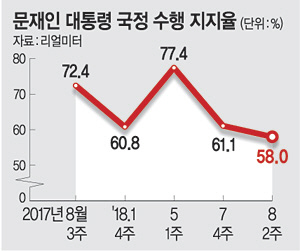 이 기관의 조사에서 문 대통령 국정 수행 지지율 60%선이 무너진 것은 이번이 처음이다. 종전 최저치는 가상화폐 대책과 평창동계올림픽 여자 아이스하키 남북 단일팀 구성을 놓고 논란을 빚은 지난 1월 4주차의 60.8%였다. 문 대통령 지지율은 4·27 남북 정상회담 직후인 5월 1주차 77.4%로 최정점을 찍었다가, 최저임금 인상 논란이 거세진 7월 3주차에는 61.7%까지 떨어지는 등 하락세를 이어왔다. 리얼미터는 “김경수 경남지사의 드루킹 특검 출석 관련 보도가 확산되고, 정부의 한시적 누진제 완화에 따른 전기요금 인하가 급격히 고조된 국민 기대감에 미치지 못하면서 비판 여론이 비등한 데 따른 것으로 풀이된다”고 분석했다.
