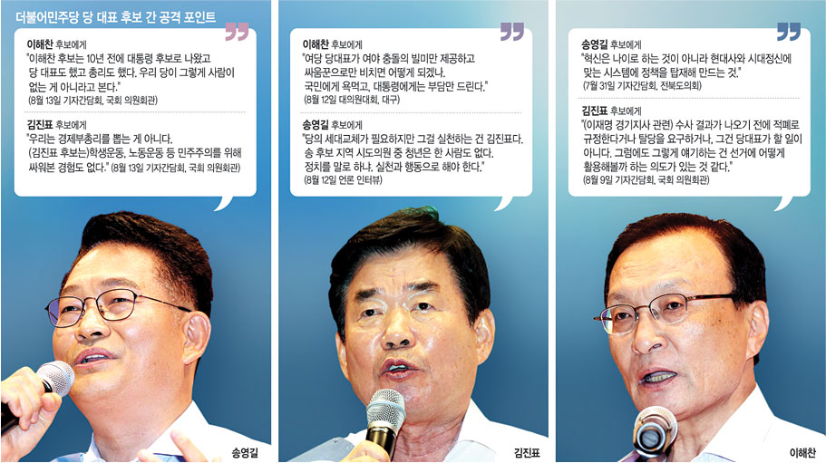 그럼에도 불구하고 후보 간 공방의 수위는 높아지고 있다. 특히 세 후보 측은 저마다 친문 후보를 자처하며 “내가 더 문 대통령과 가깝다”거나 “내가 더 친문 의원들의 지지를 받고 있다”고 경쟁하는 낯뜨거운 모습을 연출하고 있다. 친문 핵심인 전해철 의원이 지지를 선언한 김 의원은 정세균, 최재성, 김두관 의원 등의 실명을 거론하며 수십 명의 친문 의원들이 지지하고 있다고 밝히고 있고 이에 대해 이 의원 측은 공개적으로 대응하지는 않지만 또 다른 친문 핵심 인사들의 이름을 거론하며 맞서고 있다. 50대 송 의원이 꺼내 든 세대교체론에 대해서도 60대 이해찬, 70대 김진표 의원이 발끈하며 ‘나이’를 둘러싼 공방이 벌어지기도 했다.