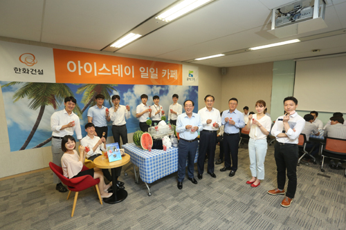 한화건설은 13일 서울 영등포구 여의동 사옥과 국내외 건설 현장에서 아이스크림과 수박 등을 나누는 ‘아이스데이(ICE DAY)’ 행사를 진행했다. 이날 최광호(앞줄 오른쪽 다섯 번째) 대표이사와 임직원들이 여의도사옥에서 수박 등으로 더위를 식히며 소통의 시간을 갖고 있다. 한화건설 제공