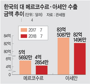 또 지난해 7월엔 5억5692만1000달러였으나 올 7월엔 4억2853만5000달러로 23% 급감했다. 아세안(동남아국가연합) 권역 수출액 역시 5~7월 3개월 연속 전년 동기 대비 1억 달러 이상씩 감소하는 추세다.