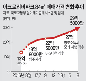 한강 조망이 가능한 대표적 강남 신축 아파트인 아크로리버파크의 경우 8·2 대책 같은 굵직한 규제가 발표·시행된 때 잠시 주춤했던 걸 제외하면 줄곧 오름세를 이어가고 있다. 분양가가 13억 원이던 84㎡가 30억 원에 육박하면서 입주(2016년 8월) 2년 만에 앉아서 16억 원 넘게 번 셈이다. 8·2 대책 후 1년간 7억 원쯤 올랐다.
