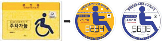 올해부터 기존 표지를 사용한 차량이 장애인 전용 주차구역에 주차할 경우 표지가 없는 차량과 마찬가지로 단속대상이 돼 10만 원의 과태료가 부과된다. 원래 교체 기간은 지난해 8월까지였지만 지난해 말로 연장됐다. 이름은 ‘장애인전용주차구역 주차표지’로, 모양은 휠체어를 형상화한 원형으로 각각 바뀌었다.
