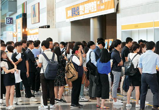 10일 오전 서울 강남구 코엑스에서 개막한 2018 물류산업 청년채용박람회에 참석자들이 길게 줄을 서 있다.