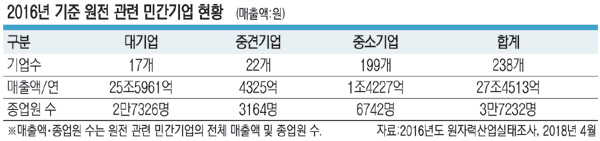 11일 국회 산업통상자원중소벤처기업위원회 소속 곽대훈(자유한국당) 의원이 원전산업회의 등으로부터 제출받은 내용(2016년 기준)에 따르면 국내 원전 관련 전문 기업은 대기업이 17개, 중견기업 22개, 중소기업이 199개인 것으로 파악됐다. 원전 관련 대기업들의 연간 매출은 25조6000억 원 규모, 중소·중견기업의 매출은 2조 원에 달하는 것으로 나타났다. 매출 차이가 상당한데 기업 수 면에선 중소·중견기업이 절대다수를 차지한다. 이들 전문 기업을 제외하고 원전 관련 부품과 기타 부품을 함께 생산하는 기업까지 포함할 경우 중소·중견기업 수는 1000개까지 늘어난다.