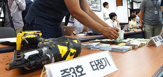 충남 당진경찰서 형사들이 10일 오후 ‘당진 농협 특수강도 사건’과 관련, 50대 여성 피의자에게서 압수한 현금 등 증거품을 정리하고 있다.
